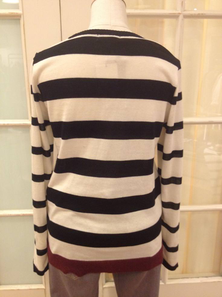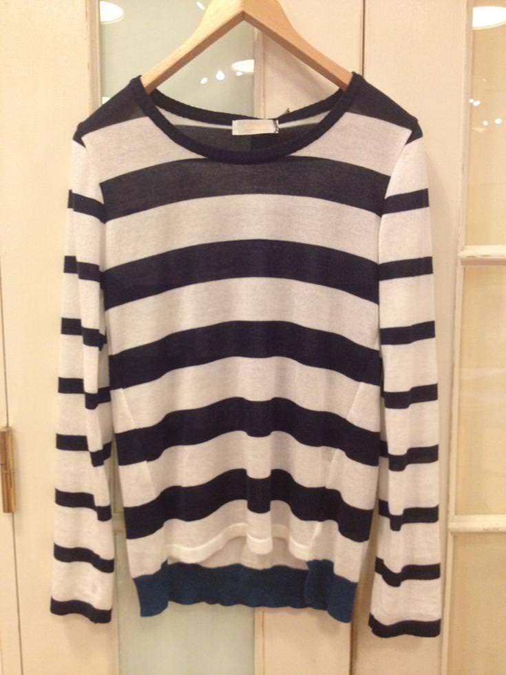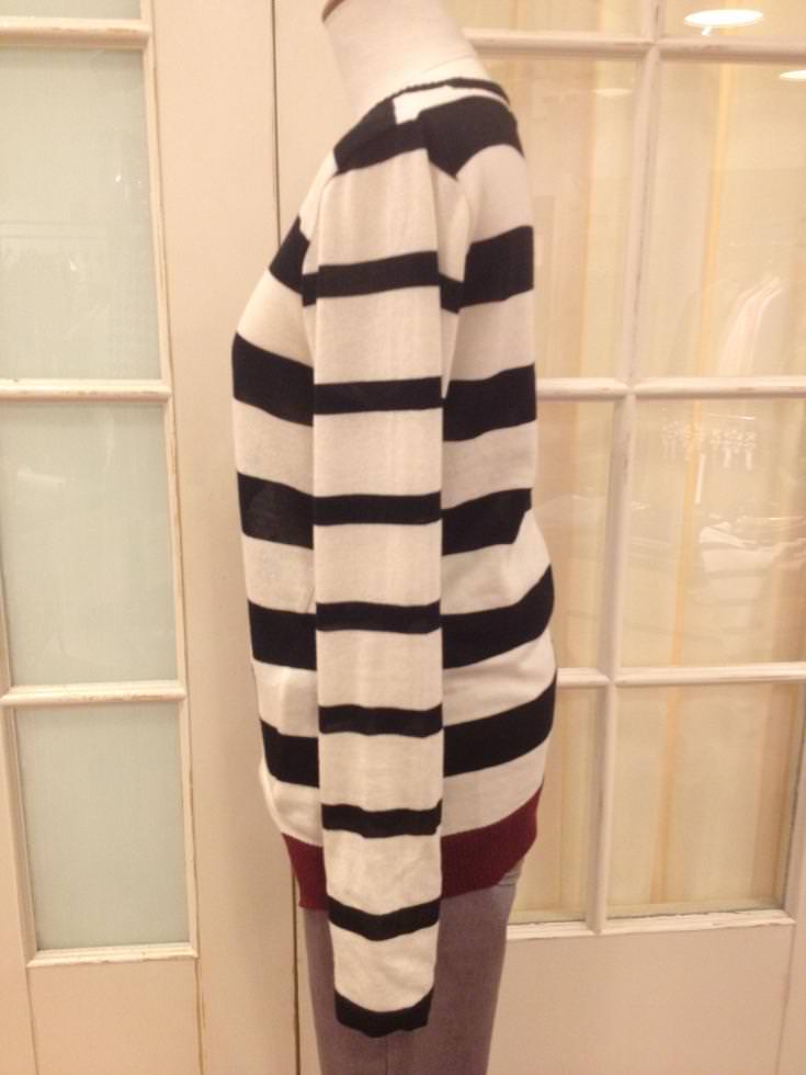 バックの配色がポイントのボーダーニット!!薄手なので今すぐ着て頂ける秋物です♪ジャケットに合わせてお仕事用に、スカートやアクセと合わせて普段にも活躍するニットですよ☆☆