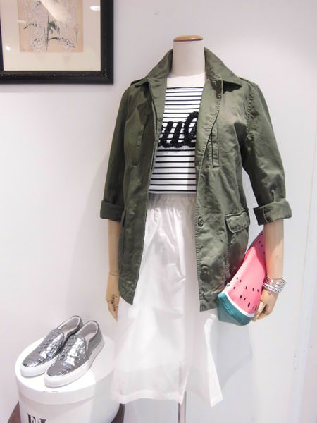 甘めのスカートもカーキで引き締めると、大人可愛いく。